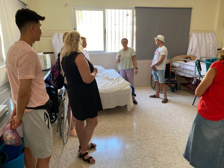 El grupo visitante atiende las explicaciones del profesorado de ciclos formativos.El taller de atención sanitaria, donde la compañera explica las enseñanzas que se imparten.