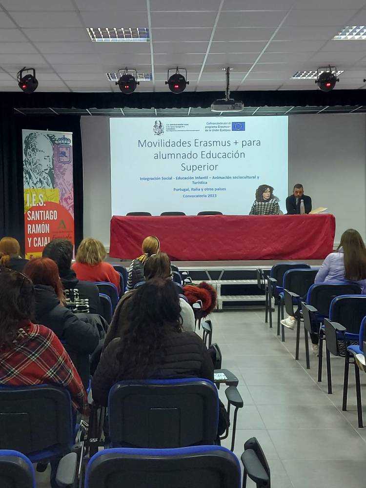 El alumnado de los ciclos formativos de grado superior del IES Santiago Ramón y Cajal de Fuengirola participó el martes 24 de enero en una jornada informativa sobre la convocatoria 2023 de Erasmus+, que permite realizar movilidades para prácticas de hasta 3 meses en el extranjero.